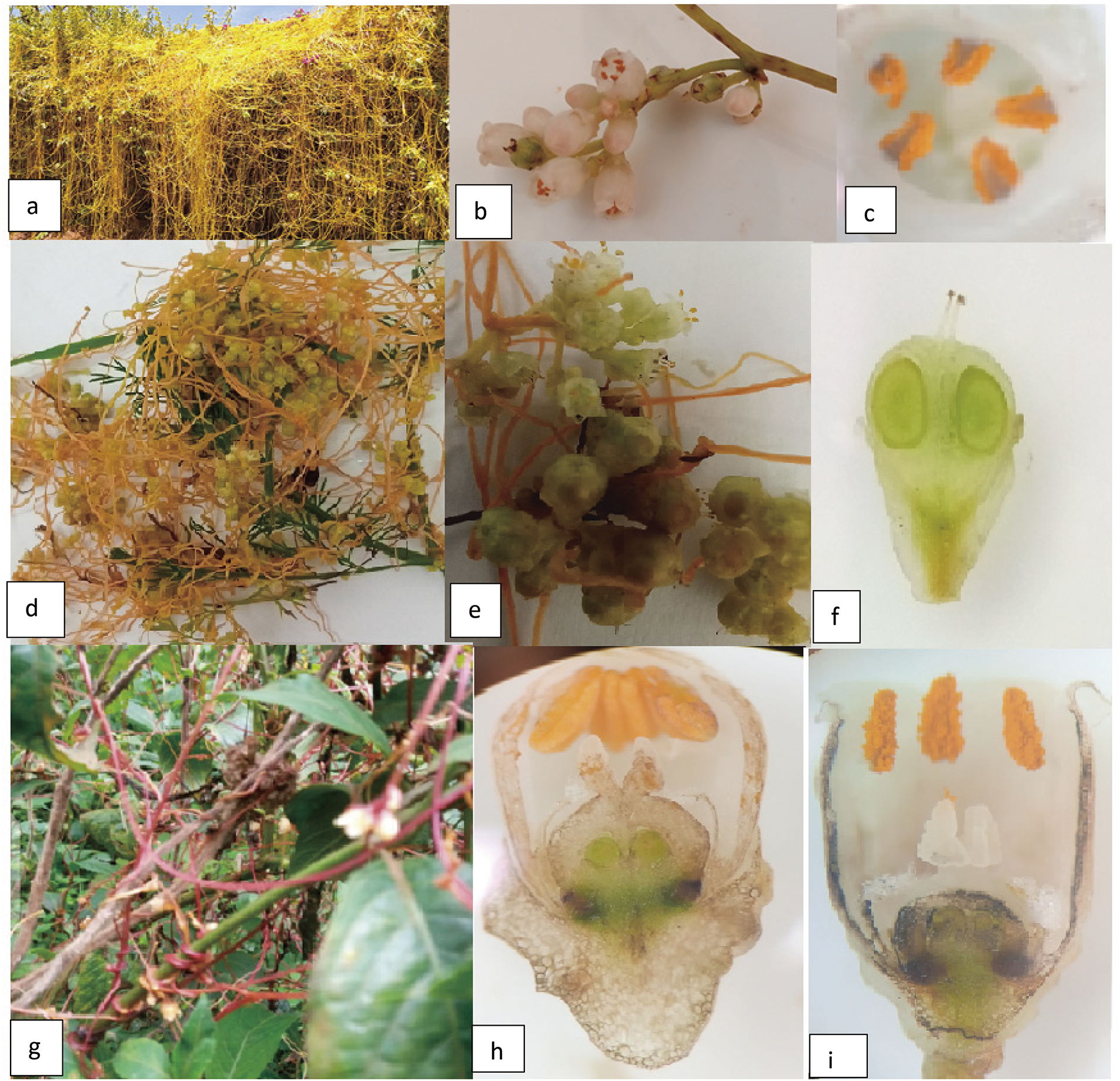 Cuscuta Kilimanjari species was not well distributed across Uasin Gishu County but was found along the forested mountain areas. This species had thick, coarse and purple vines with pale white flowers while the stamens were shorter than the lobes, with short and thick filaments. The styles were teo separate short and thick with white stigmas, displaying purple spots in the ovaries (Figs. 1a–i) (Sharma & Kapoor, 2014).
